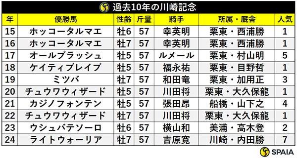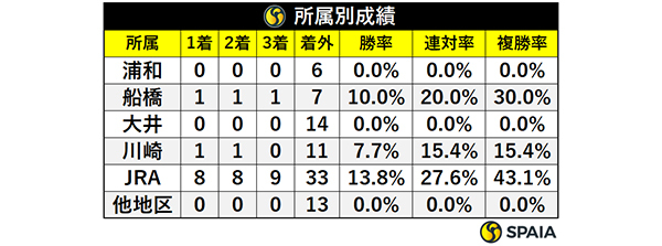 所属はJRAが8勝を含む連対馬16頭(栗東13、美浦3)と断然リード。地方馬は船橋と川崎がともに1勝を含む2連対となっている。